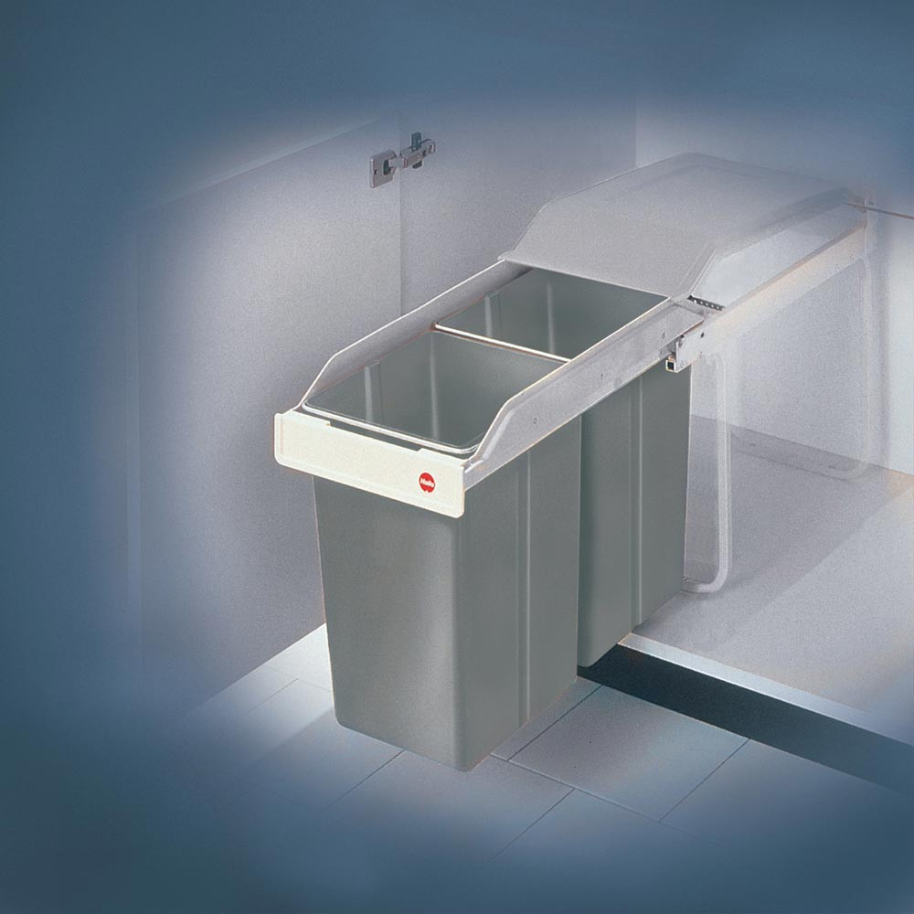 Inhalt 2 x 15 l · 2-fach Mülltrennung, für Unterschränke ab 300 mm · durch Kombination der Systeme ist auch 4-fach Trennung möglich · die Eimer haben mit 2 mal 15 Litern ein sehr großes Fassungsvermögen · sie sind hintereinander angeordnet und liegen in einer Schiene zum Rausziehen · das Rahmengestell besteht aus Stahlblech, cremeweiß und ist verschleißfest · Abfalleimer und Deckel sind aus robustem, pflegeleichtem Kunststoff · einfache Montage