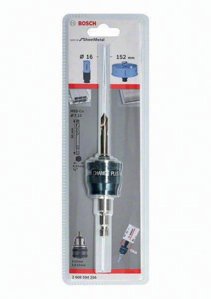 schlüsselloses System · nur ein einfacher Klick, um die Lochsäge zu entfernen · schneller und einfacher Auswurf des Bohrkerns · Zentrierbohrer HSS-G sind für Holz, Trockenbauwände Kunststoffe, Metalle und Nichteisenmetalle sowie Edelstahl geeignet