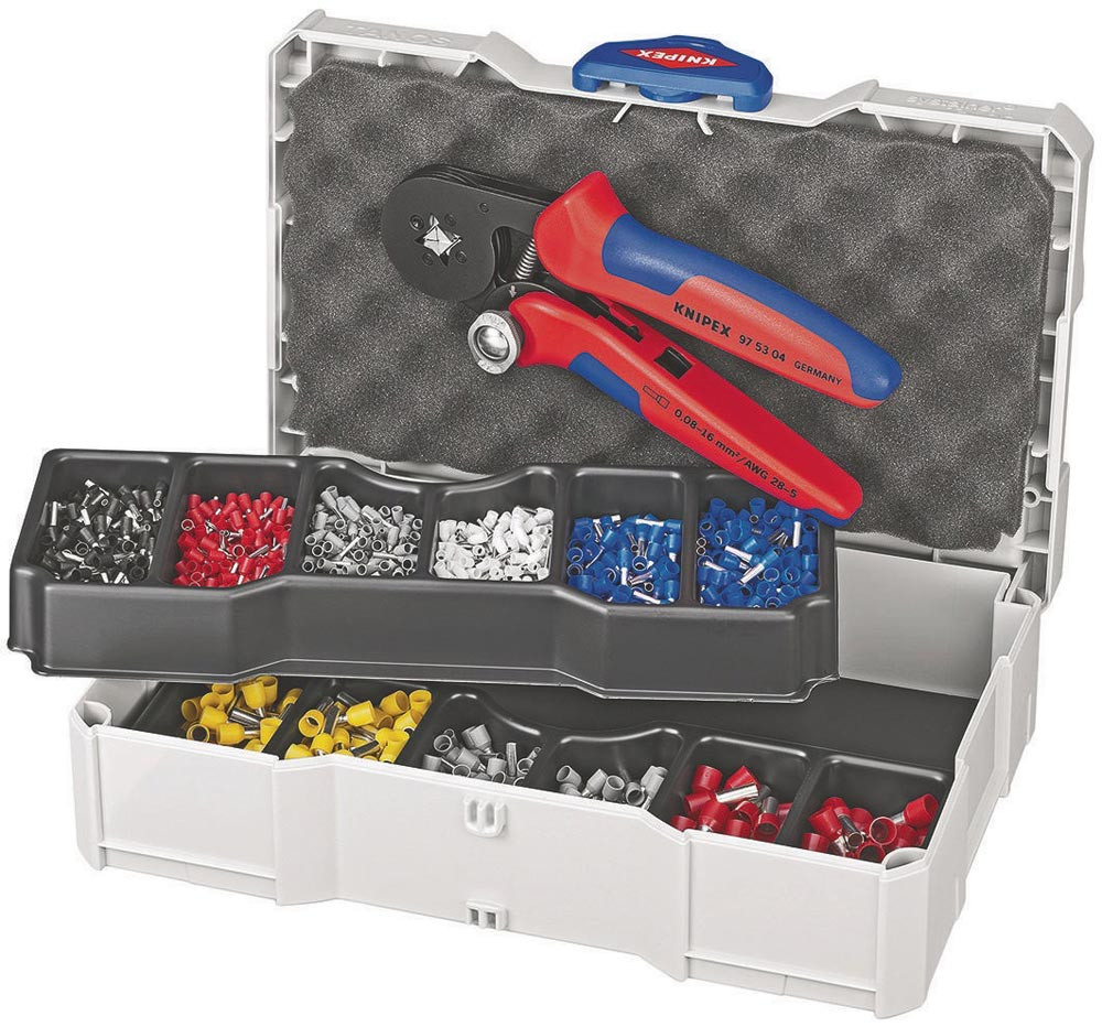 im Mini-Systainer, 2 stapelbare Kunststoffeinsätze mit je 6 Mulden für Verbinder · mit einem Sortiment Aderendhülsen mit und ohne Kunststoffkragen