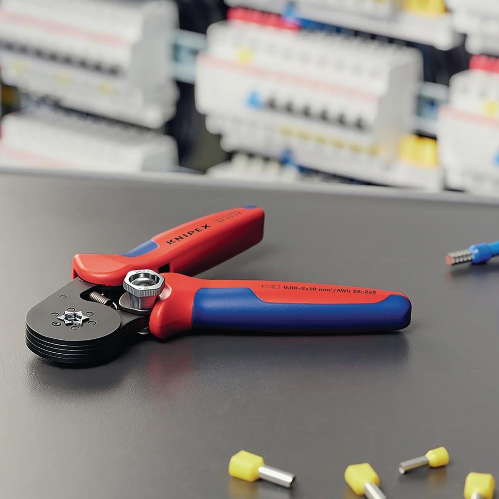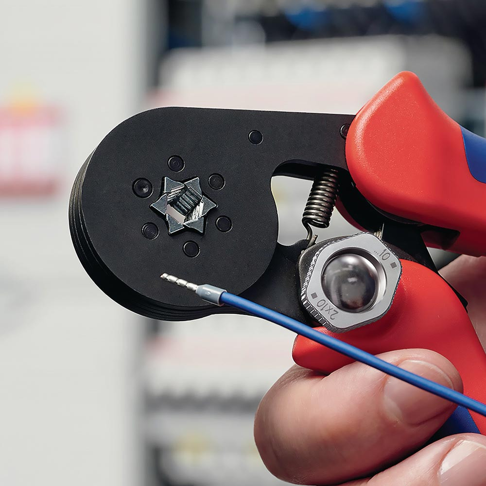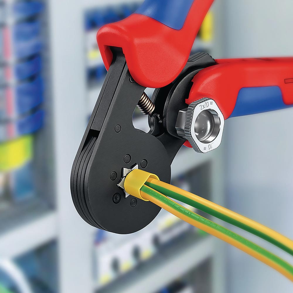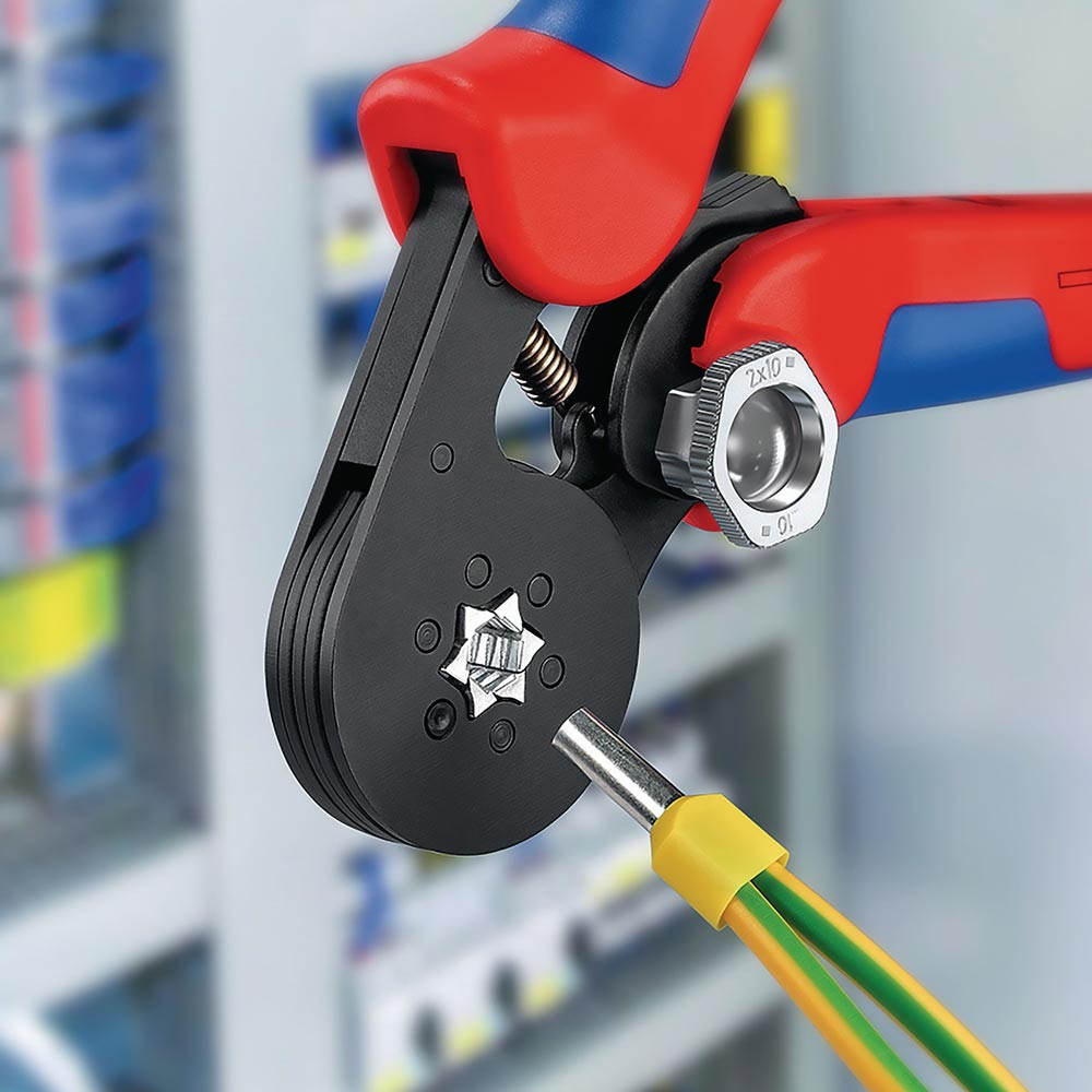 selbsteinstellend · für Aderendhülsen · mit Seiteneinführung · zum Verpressen von Aderendhülsen nach DIN 46228 (Teil 1 + 4) · für beengte Anschlussmaße · mit dem selbsteinstellenden Sechskant-Crimpprofil werden Aderendhülsen einfach, schnell und zuverlässig vercrimpt · Chrom-Vanadin-Elektrostahl in Sondergüte, ölgehärtet · Sechskantcrimpung, für Twin-Aderendhülsen bis 2 x 10 mm², mit Umschalthebel für 16 mm²
