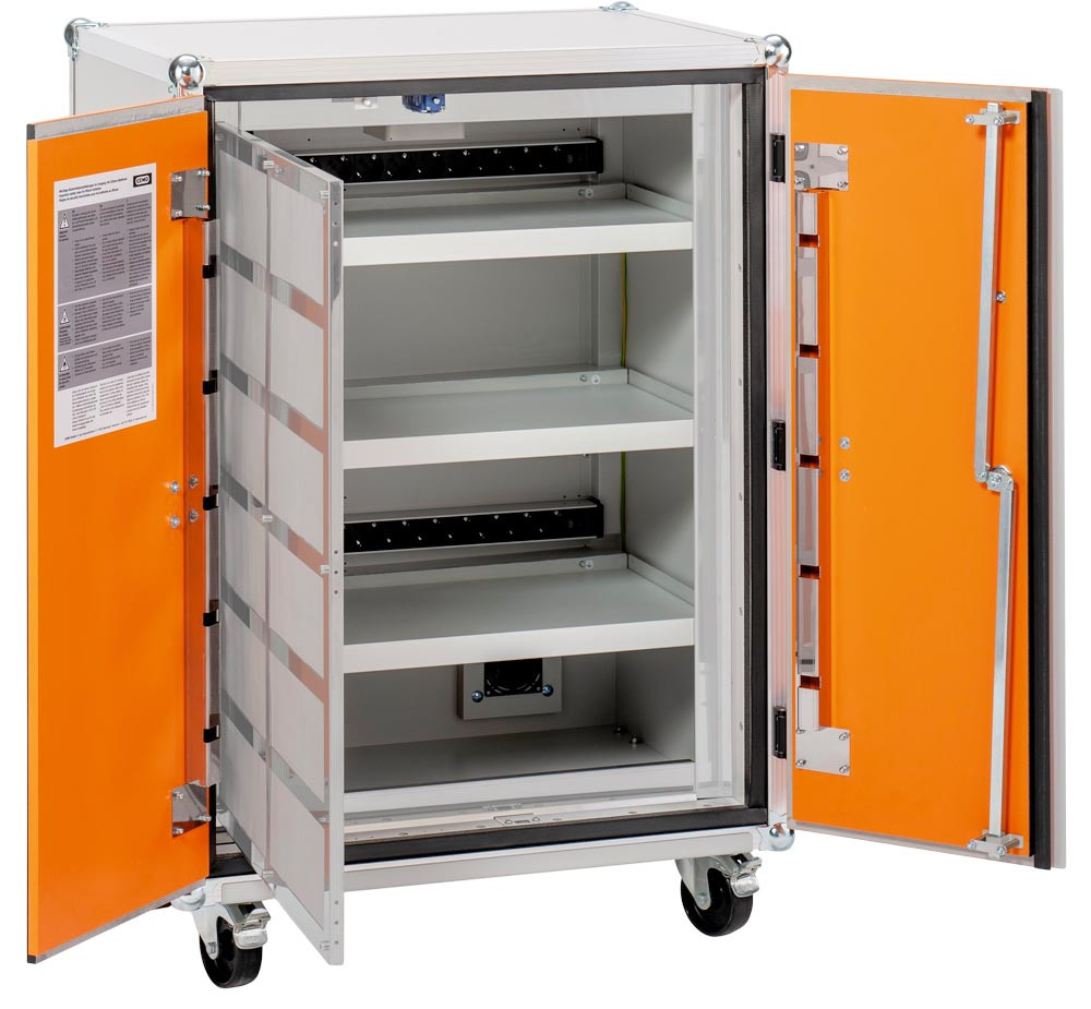 Akku-Ladeschrank, Basis, Rauchmelder, techn. Lüftung, 3-phasig, Tür orange, Stapelfüße, Korpus grau E6501441