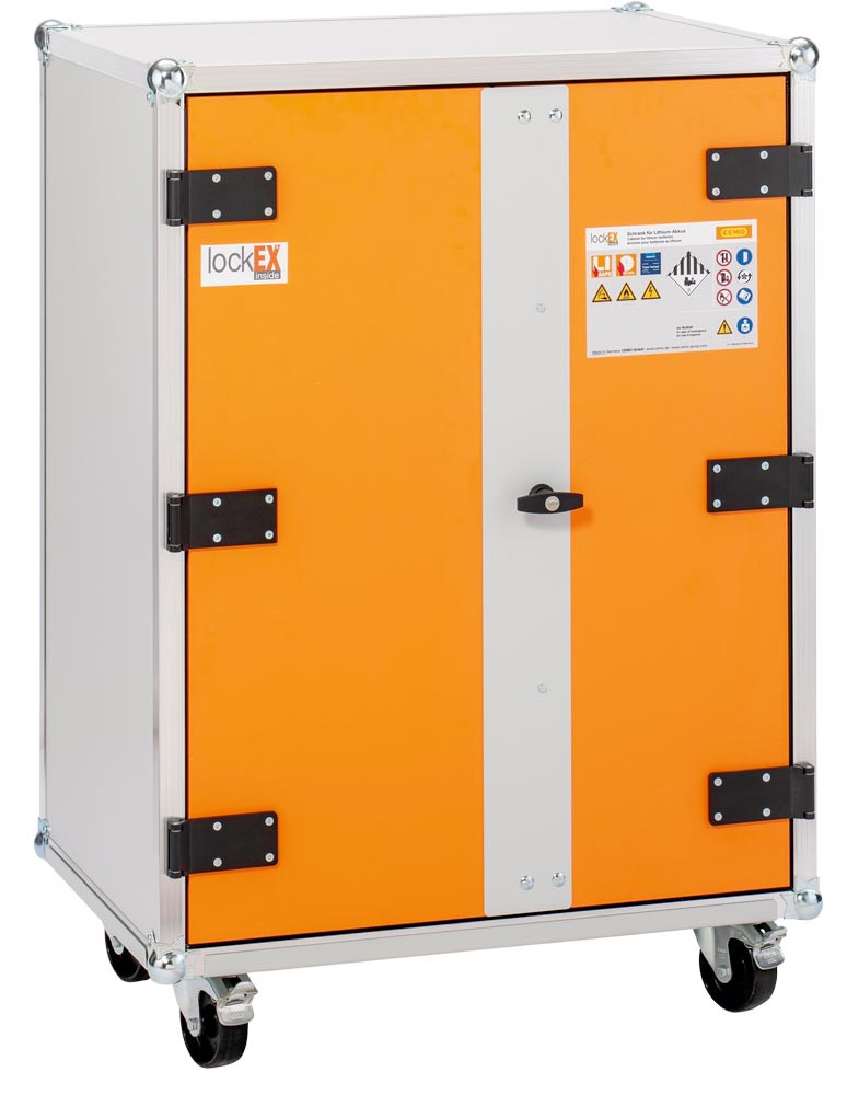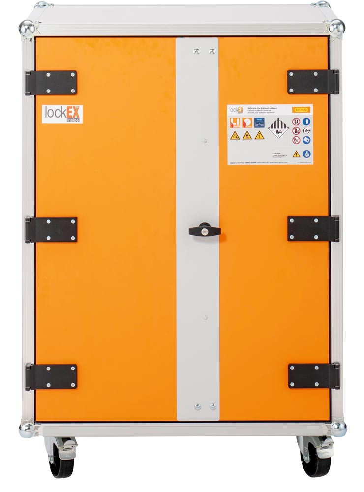 ∙ Sicherheitsregeln zum Laden von Lithium-Batterien werden eingehalten ∙ Laden mehrerer Li-Akkus im Schrank ∙ Frühzeitige Alarmierung im Schadensfall ∙ Schützt effektiv über die marktüblichen 90 Minuten hinaus – kompromisslos und ganz ohne Zeitlimit ∙ Bauweise mit nicht brennbaren, feuerwiderstandsfähigen Komponenten ∙ Transportierbar zum Positionieren am Aufstellort ∙ Zweiflügelige Türen, abschließbar · Wärmeabfuhr während des Ladevorgangs durch Ventilator · Sofortige Unterbrechung des Ladevorgangs beim Öffnen der Türen · Bei einer Störung wird der Ladevorgang umgehend beendet · Thermoelemente sorgen für den Verschluss der Zu- und Abluftöffnung · Zwei akustische, batteriebetriebene Rauchmelder · Geprüft nach VDMA-Standard ∙ lockEX 2.0 ist nach dem neuesten VDMA Einheitsblatt geprüft