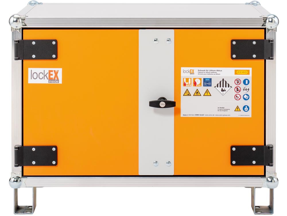 ∙ Sicherheitsregeln zum Laden von Lithium-Batterien werden eingehalten ∙ Laden mehrerer Li-Akkus im Schrank ∙ Frühzeitige Alarmierung im Schadensfall ∙ Schützt effektiv über die marktüblichen 90 Minuten hinaus – kompromisslos und ganz ohne Zeitlimit ∙ Bauweise mit nicht brennbaren, feuerwiderstandsfähigen Komponenten ∙ Transportierbar zum Positionieren am Aufstellort ∙ Zweiflügelige Türen, abschließbar · Wärmeabfuhr während des Ladevorgangs durch Ventilator · Sofortige Unterbrechung des Ladevorgangs beim Öffnen der Türen · Bei einer Störung wird der Ladevorgang umgehend beendet · Thermoelemente sorgen für den Verschluss der Zu- und Abluftöffnung · Zwei akustische, batteriebetriebene Rauchmelder · Geprüft nach VDMA-Standard ∙ lockEX 2.0 ist nach dem neuesten VDMA Einheitsblatt geprüft