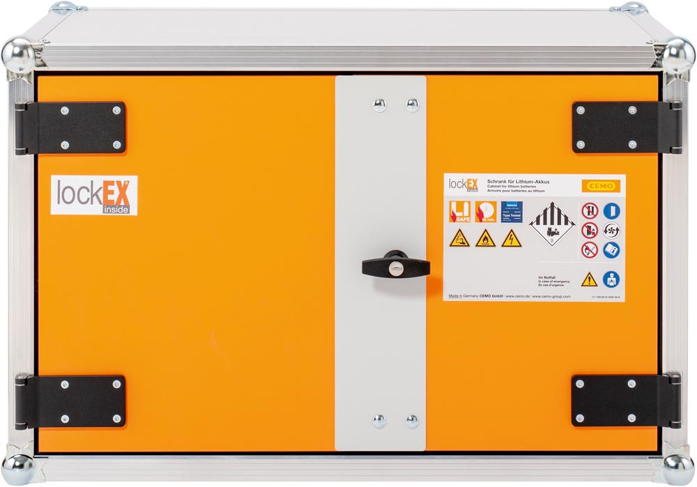 Sicherheitsregeln zum Laden von Lithium-Batterien werden eingehalten ∙ Frühzeitige Alarmierung im Schadensfall ∙ Schützt effektiv über die marktüblichen 90 Minuten hinaus – kompromisslos und ganz ohne Zeitlimit ∙ Bauweise mit nicht brennbaren, feuerwiderstandsfähigen Komponenten ∙ Zweiflügelige Türen, abschließbar ∙ Geprüft nach VDMA-Standard ∙ lockEX 2.0 ist nach dem neuesten VDMA Einheitsblatt geprüft