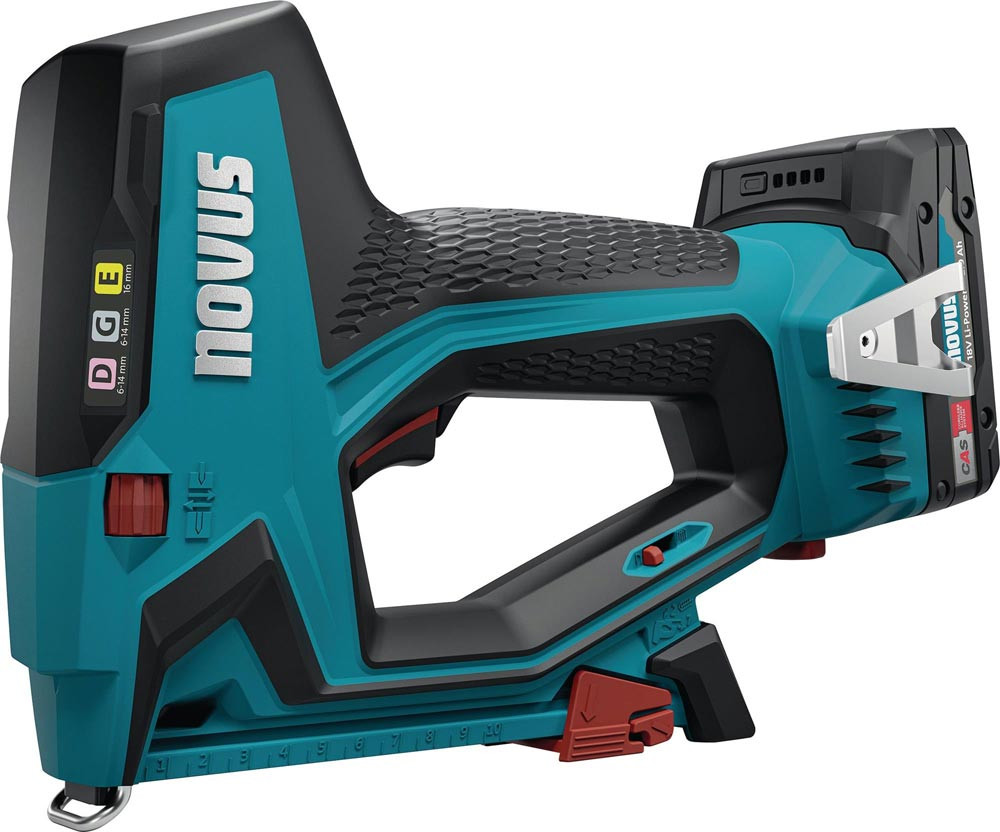 professioneller Akkutacker · Serienschuss Funktion - 3 Schuss pro Sekunde · Tiefeneinstellung: Abstandseinstellung bis 2 mm · Distanzanschlag · Unterlademechanik mit integriertem Klammerschieber · integrierte LED · Klammerfüllstandsanzeige · lange Nase für präzises Arbeiten an schwer zugänglichen Stellen · gummierte Stirnseite · Freischusssicherung