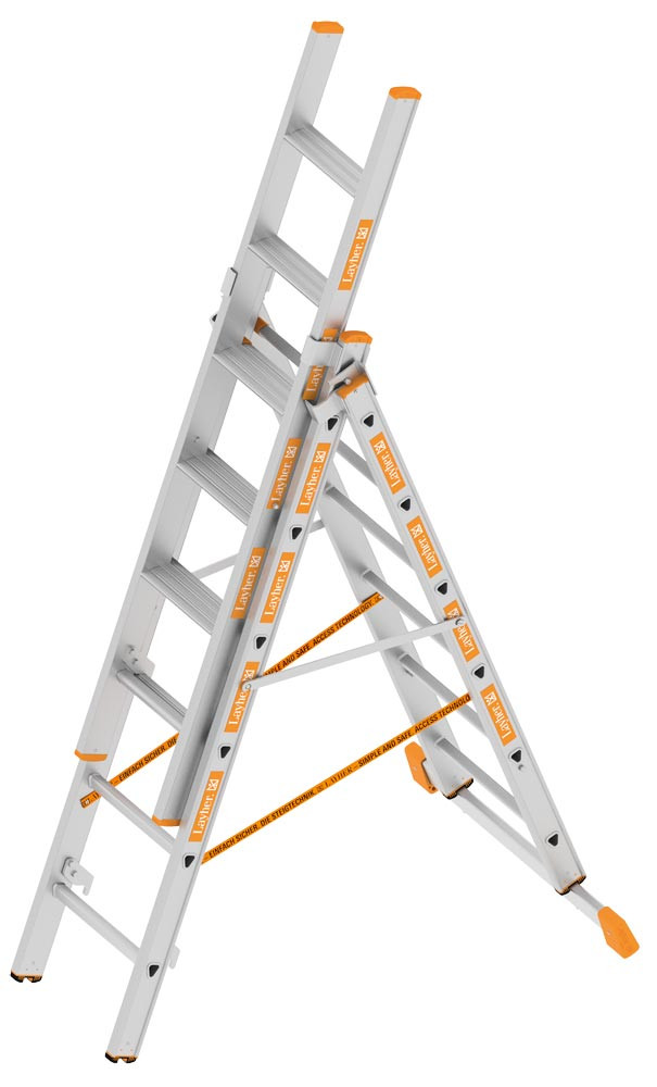 Dreiteilige Aluminium-Allzweckleiter ∙ Mit Stufen ∙ Wahlweise als Schiebeleiter, Anlegeleiter, Stehleiter oder verlängerbare Stehleiter einsetzbar ∙ Sicherer freistehender Stand der Leiter durch Traverse ∙ Aluminiumaussteifer verhindern ein versehentliches Lösen, können aber per Knopfdruck einfach entriegelt werden ∙ Sprossenweise manuelle Höhenverstellung durch Aufsetzhaken ∙ Sicherung gegen Ausheben und Ausschieben ∙ Sicherungsklappen verhindern beim Tragen ein seitliches Verschieben der Leiternteile ∙ Oberleiter mit verschweißten Stufen ∙ Mit rutschhemmenden Eigenschaften des Stufenprofils (entspricht der Bewertungsgruppe R12) ∙ 80 mm tiefe Stufen entsprechend den TRBS 2121-2 Richtlinien