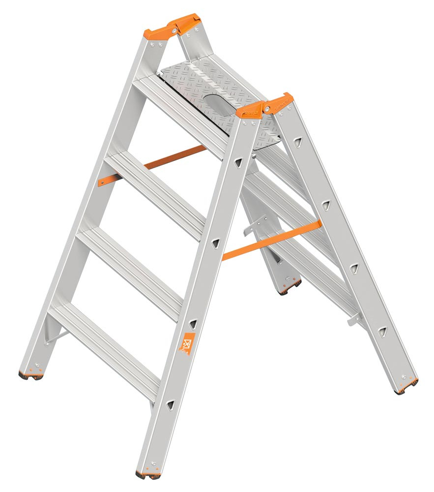 Aluminium-Schwerlasttritt ∙ Breite Stufen 80 mm · Kunststoffummantelte Stahlscharniere · Verstärkungswinkel · Reißfeste Gurtbänder · Belastbar bis 200 kg ∙ Entspricht der TRBS 2121-2 und der Rutschhemmung R12 in Trittrichtung