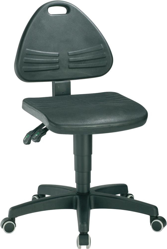nach DIN 68877 · bedienungsfreundliche Gasfeder-Sitzhöhenverstellung · stufenlose Verstellung der Sitzflächenneigung · stufenlose Rückenlehnen-Neigung · Rückenlehnen-Höhenverstellung ist im Sitz verstellbar optimal einstellbar · integrierter Tragegriff · Fünffuß-Untergestell aus Kunststoff, flach auslaufend, kipp- und stolpersicher · Sitz und Rückenlehne aus robustem Integralschaum, beständig gegen mechanische Einwirkung, sowie leichte Säuren und Laugen, leicht abwaschbar · eingearbeitete Lordosenstütze für eine optimale Abstützung im Lendenwirbelbereich · Untergestell mit lastabhängig gebremsten Sicherheits-Doppelrollen für harte Böden