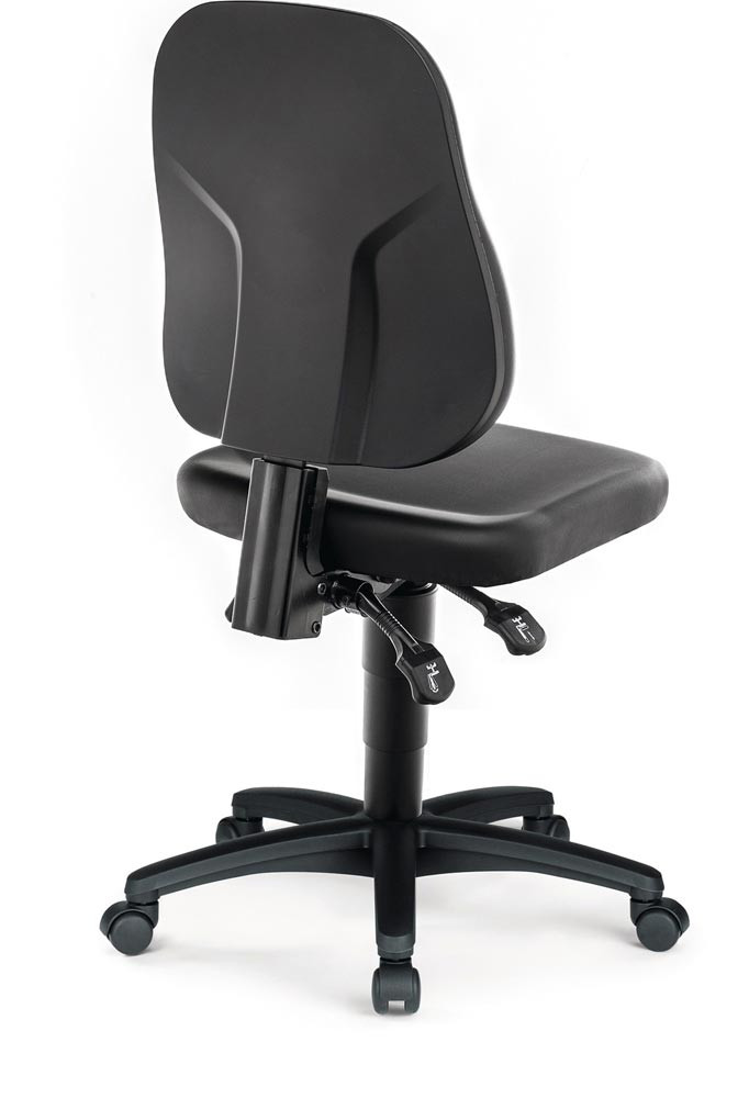 nach DIN 68877 · bedienungsfreundliche Gasfeder-Sitzhöhenverstellung · ergonomisch geformter Sitz mit integrierter Lordosenstütze · Neigungsverstellung von Sitz und Rückenlehne · Rückenlehne mit Permanentkontakt und Höhenverstellung · Komfortpolsterung mit Kunstlederbezug, leicht abwaschbar · Fünffuß-Untergestell aus Kunststoff, flach auslaufend, kipp- und stolpersicher mit lastabhängig gebremsten Sicherheits-Doppelrollen für harte Böden