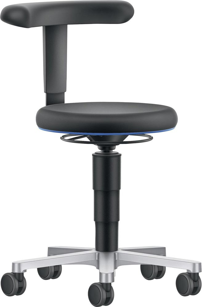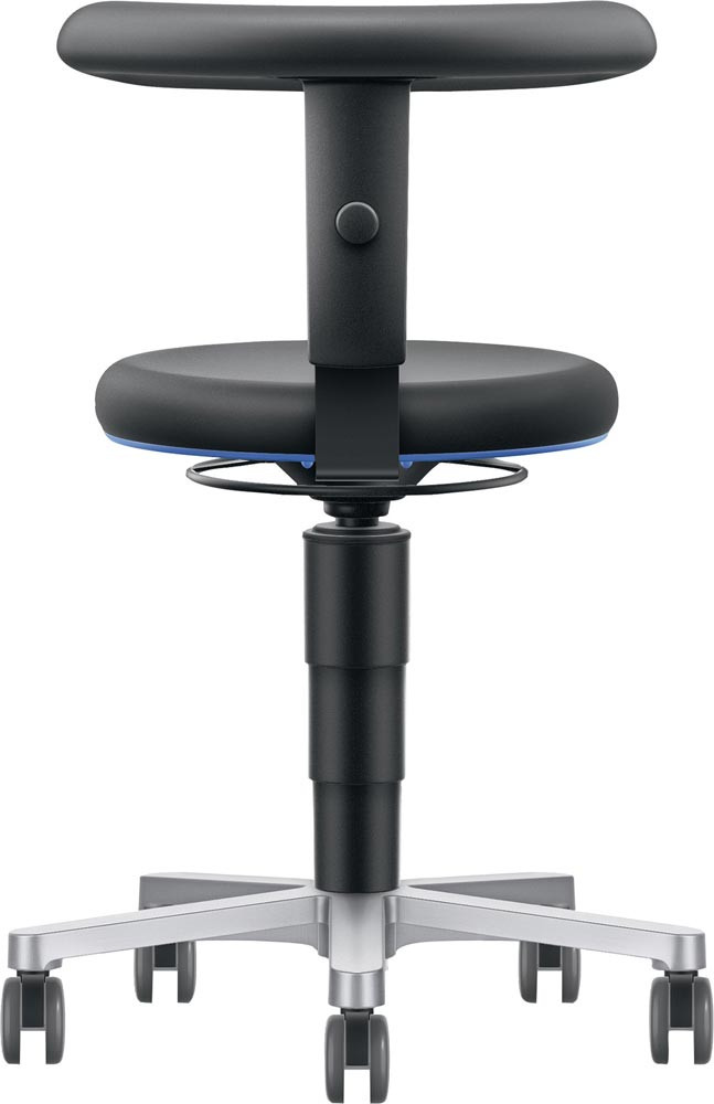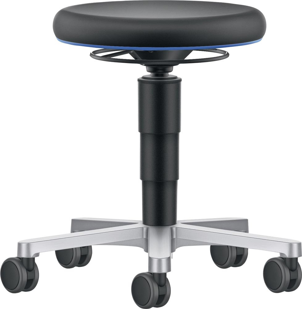 nach DIN 68877 · bedienungsfreundliche Gasfeder-Sitzhöhenverstellung mit umlaufender Ringauslösung · blaue Ringabdeckung zum Schutz der Polster · abgerundetes Integralschaumpolster Ø 400 mm, sehr robust, abwaschbar, widersteht mechanischen Einflüssen · dicke Polsterung für ein komfortables Sitzgefühl · kompaktes Fünffuß-Untergestell aus poliertem Aluminium Ø 500 mm, hygienisch und einfach zu reinigen Untergestell mit extra großen weiche Universalrollen Ø 65 mm für leichtgängiges Rollen über alle Böden