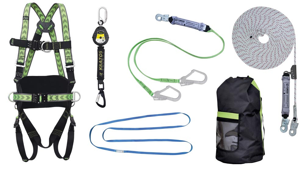 Bestehend aus: 4-Punkt Auffanggurt mit Klickverschlüssen nach EN 361:2002 und EN 358:2019 ∙ 1 Auffangöse hinten im Schulterbereich ∙ 1 Auffangöse vorne im Brustbereich ∙ 2 seitliche Halteösen ∙ Höhensicherungsgerät nach EN 360:2002 und DIN 19427:2017, Länge 1,80 m (auch zugelassen für Hubarbeitsbühnen) ∙ Mitlaufendes Auffanggerät Typ FSK-SK12, Länge15 m ∙ 2-strängiges Verbindungsmittel Typ Y-BFD-GB27, Länge 2 m ∙ Bandschlinge, Länge 2 m ∙ Rucksack, schwarz ∙ Anwendergewicht: 140 kg