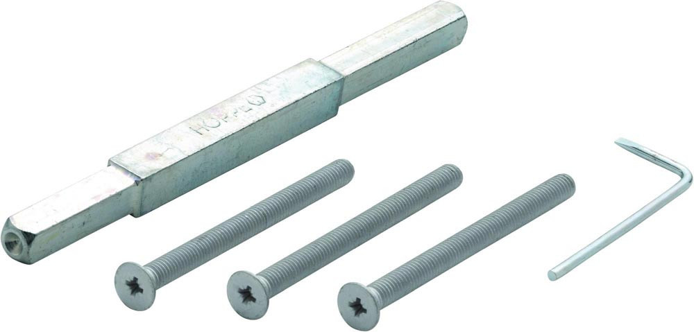 HOPPE-Befestigungs-Set: Gewindeschrauben M6 nach DIN 965-10.9 mit Kreuzschlitz-Senkkopf HOPPE-Vollstift (beidseitig abgesetzt von 10 auf 8 mm) und Demontage-Schlüssel für HOPPE-Schutz-Türgriff-Garnituren ES1/ES2 (SK2/SK3) mit HOPPE-Schnellstift und den Schildern (E)2210 · (E/M)3310 · verdeckte Befestigung