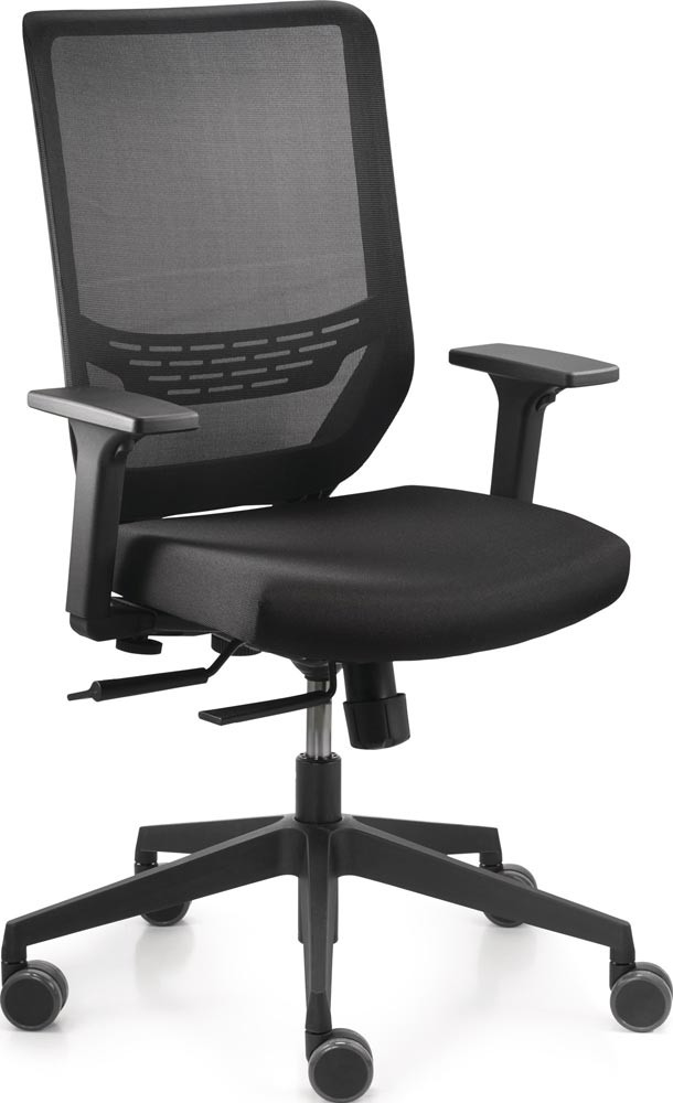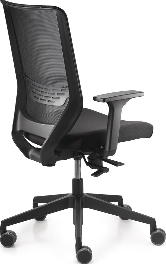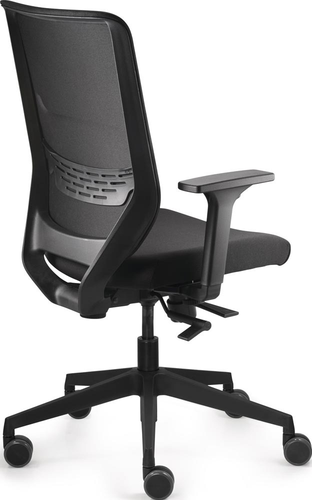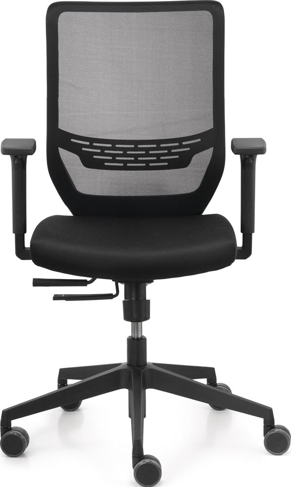 mit Synchron-Technik (mit Armlehnen) · für überwiegend sitzende Tätigkeiten · Kunststoff-Fußkreuz, schwarz · mit hoher atmungsaktiver Netzrückenlehne, mit höhenverstellbarer Lumbalstütze · Stufenlose Federkraftverstellung für ein Körpergewicht von 45 - 125 kg · inklusive Armlehnen, höhen- und breitenverstellbar · 5 cm Sitztiefenverstellung · Bezug 100 % Polyester · Sitzfläche B 480 x T 430 - 480 mm · Lehnenhöhe 570 mm · Universalrollen für weiche und harte Böden