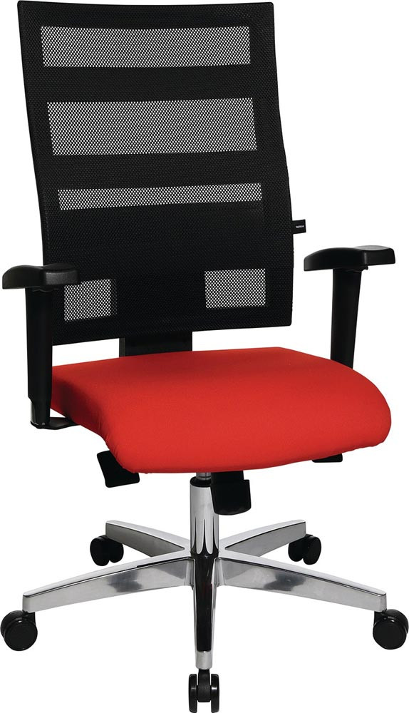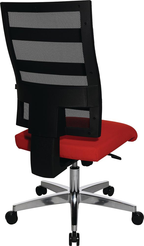 mit Punkt-Synchron-Technik (ohne Armlehnen) · für überwiegend sitzende Tätigkeiten · Aluminiumfußkreuz poliert · Rückenlehne mit atmungsaktiver Netzbespannung schwarz, Rückseite mit elastischen Gummibändern, höhenverstellbar · Flachsitz mit komfortabler Knierolle · Bezug Rückenlehne 100 % Polyester, Sitzfläche 100 % Trevira CS · Sitzfläche B 480 x T 480 mm · Lehnenhöhe 600 mm · Rollen für weiche Böden · Lieferung erfolgt zerlegt