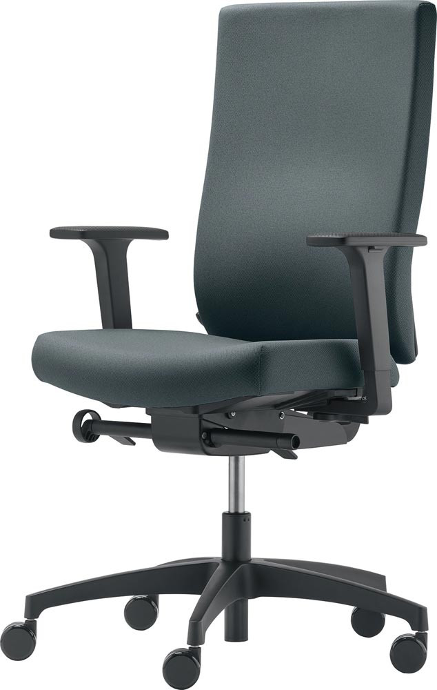 mit Synchrontechnik (mit Armlehnen) · für überwiegend sitzende Tätigkeiten · stabiles Kunststofffußkreuz, schwarz · hohe Polsterrückenlehne · Armlehnen höhen- und breitenverstellbar, mit PU-Auflage · seitliche Einstellung des Rücklehnengegendrucks im Sitzen mittels Handrad · Polster 100 % Polyester · Sitzfläche B 470 x T 380-440 mm · Sitztiefenverstellung 60 mm mittels Schiebesitz · Lehnenhöhe 610-680 mm · Universalrollen für weiche und harte Böden
