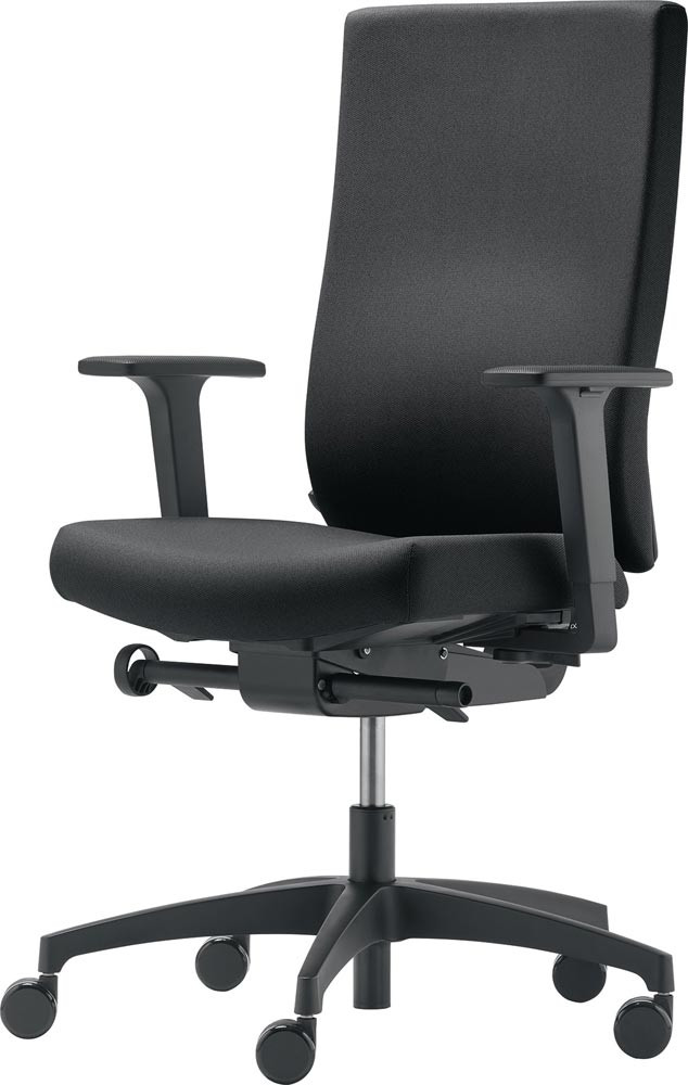 mit Synchrontechnik (mit Armlehnen) · für überwiegend sitzende Tätigkeiten · stabiles Kunststofffußkreuz, schwarz · hohe Polsterrückenlehne · Armlehnen höhen- und breitenverstellbar, mit PU-Auflage · seitliche Einstellung des Rücklehnengegendrucks im Sitzen mittels Handrad · Polster 100 % Polyester · Sitzfläche B 470 x T 380-440 mm · Sitztiefenverstellung 60 mm mittels Schiebesitz · Lehnenhöhe 610-680 mm · Universalrollen für weiche und harte Böden