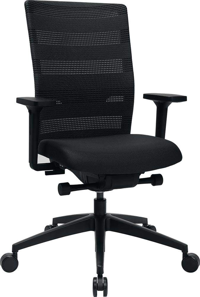 mit Synchron-Technik · (mit Armlehne) · für überwiegend sitzende Tätigkeiten · Kunststofffußkreuz, schwarz · Rückenlehne mit atmungsaktivem Netzbezug und höhenverstellbarer Lordosenstütze · Federkraft passt sich automatisch dem Nutzgewicht an, durch eine Drehkurbel feinjustierbar · Rückenneigung durch Wegbegrenzung 4-stufig einstellbar · Muldensitz mit integrierter 3D-Bewegung für eine dreidimensional bewegliche Sitzfläche · Sitztiefenverstellung 75 mm mittels Schiebesitz · Armlehnen höhenverstellbar · Bezug Polster 100% Polyester, Netzrückenlehne 100% Polyester · Sitzfläche B 455 x T 410-475 mm · Lehnenhöhe 575 mm · Rollen für weiche Böden