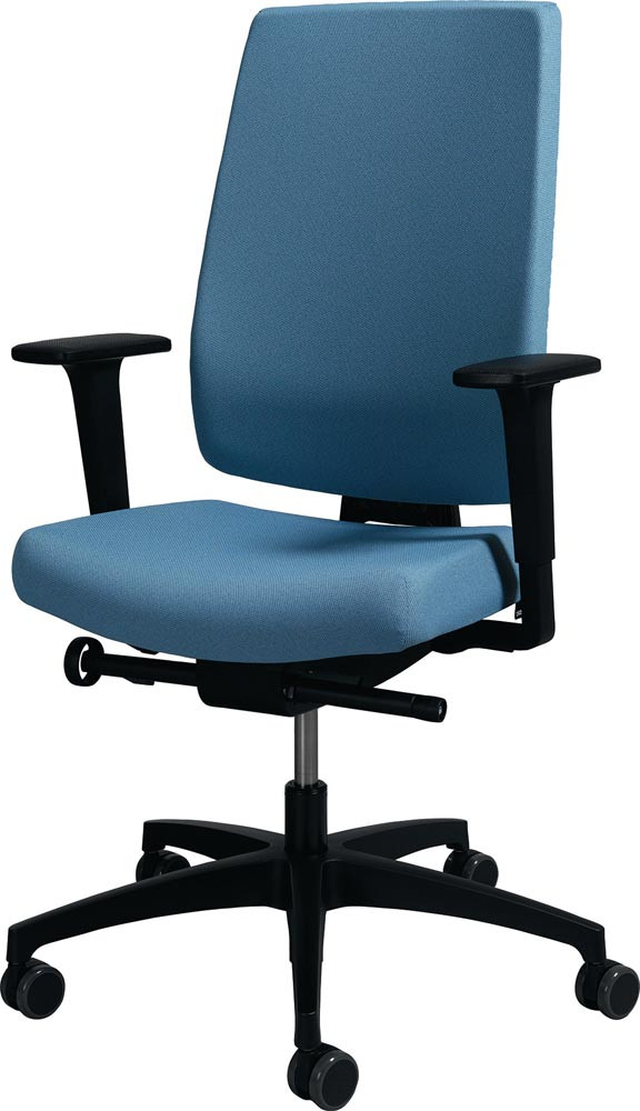 mit Synchrontechnik (mit Armlehnen) · für überwiegend sitzende Tätigkeiten · belastbar bis 150 kg Körpergewicht · stabiles Kunststofffußkreuz, schwarz · hohe Polsterrückenlehne höhenverstellbar mittels Easy-Touch-System · Armlehnen höhen- und breitenverstellbar, mit PU-Auflage · seitliche Einstellung des Rückenlehnengegendrucks im Sitz mittels Handrad · Polster 100 % Polyester · Sitzfläche B 470 x T 380-440 mm · Sitztiefenverstellung 80 mm mittels Schiebesitz · Lehnenhöhe 610-680 mm · Universalrollen für weiche und harte Böden