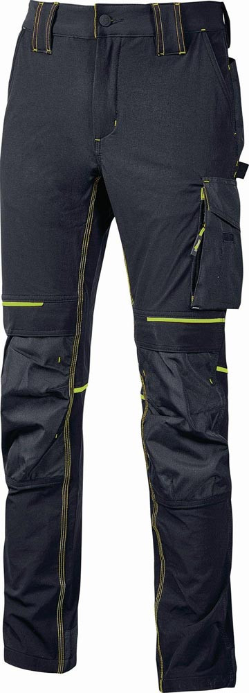 90% Nylon / 10% Elastan, ca. 260 g/m² · 4-Wege-Stretch, sehr strapazierfähig, bequem und weich · wasserabweisend, schmutzabweisend, atmungsaktiv und schnelltrocknend · zwei große Fronttaschen · elastischer Bund mit innovativem, versenkbarem Verstellsystem · hochgezogener Lendenschutz · Reflexprofile vorne und hinten sowie rotes Reflexband an der hinteren Gürtelschlaufe · multifunktionale Seitentasche für Werkzeug mit herausziehbarem Ausweisfach · zwei Gesäßtaschen, eine mit Patte und eine mit Sicherheitsklettverschluss · zwei Kniepolstertaschen mit einfachem Einschub und Stoßborte