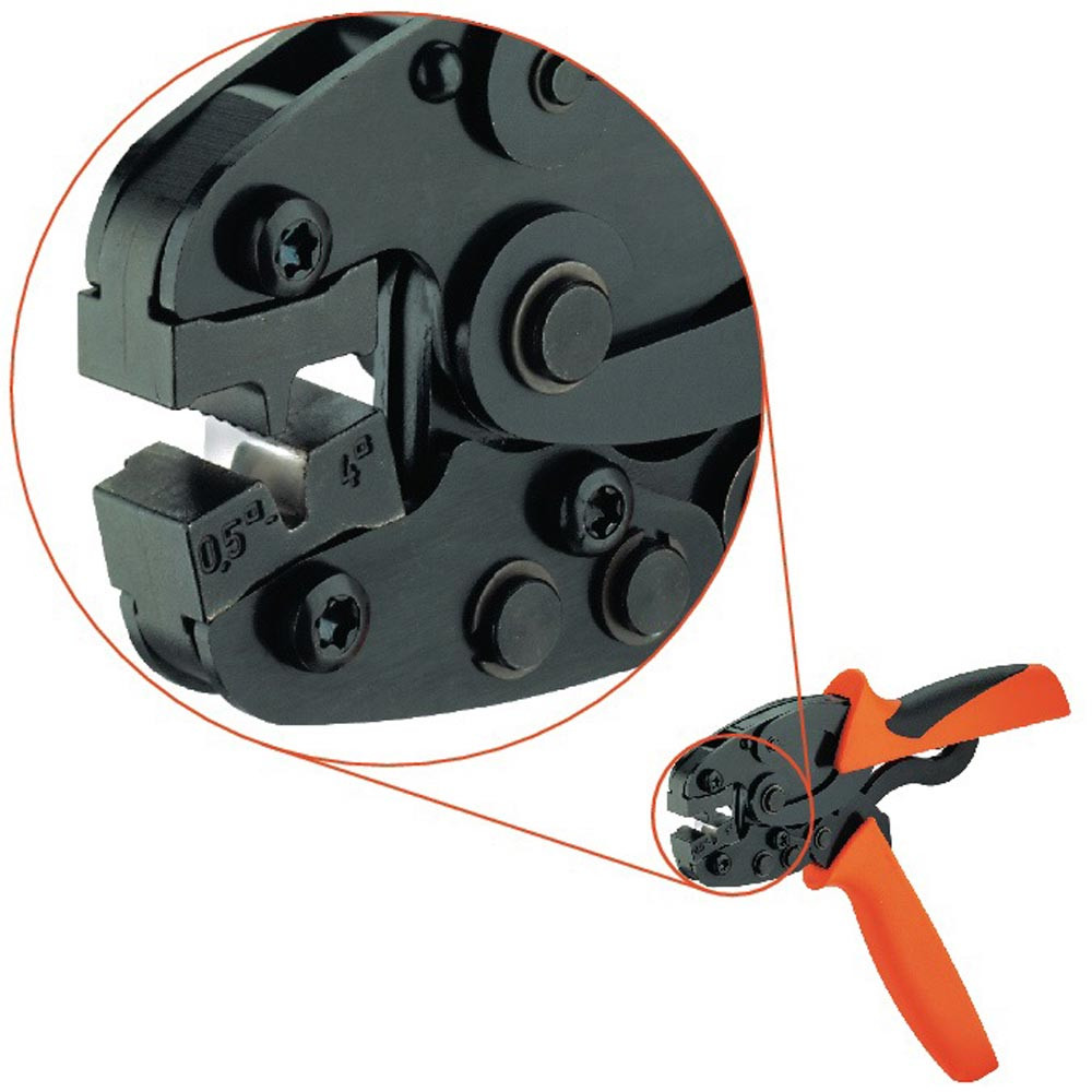 für Aderendhülsen (nach DIN 46228 T. 1 und 4) mit und ohne Kunststoffkragen von 0,5...6 mm² (~AWG 20... 10) · Zwangssperre garantiert Qualitätscrimp · Entriegelungsmöglichkeit bei eventueller Fehlbedienung · nur ein Gesenk für den gesamten Querschnittsbereich