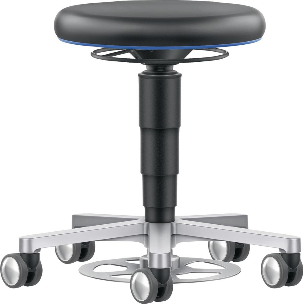 nach DIN 68877 · bedienungsfreundliche Gasfeder-Sitzhöhenverstellung mit umlaufender Ringauslösung oder hygienischer Fußauslösung · blaue Ringabdeckung zum Schutz des Polsters · Sitz Ø 400 mm, mit Kunstlederpolster, abwaschbar, desinfektionsmittelbeständig, weich und bequem · kompaktes Fünffuß-Untergestell aus poliertem Aluminium Ø 540 mm, hygienisch und einfach zu reinigen · extra große, weiche Universalrollen Ø 65 mm für leichtgängiges Rollen über alle Böden