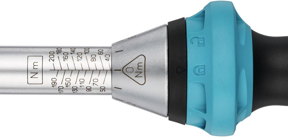 mit Umschaltknarre · für Rechtsgang · automatische, deutlich hör- und spürbare Kurzwegeauslösung beim Erreichen des vorgewählten Drehmomentes · Auslösegenauigkeit ± 3 % vom eingestellten Skalenwert (in Betätigungsrichtung) · Befestigungsmöglichkeit für Seilschlaufe durch Öffnungen am Verriegelungs-Drehkranz · dauerhafte Lesbarkeit durch Laserbeschriftung der Skalenhülse · Abrollschutz · Einstellhilfe durch Rastpunkte gewährleistet sicheres und schnelles Einstellen des gewünschten Drehmomentwertes durch Drehen des Griffes · 2-Komponentengriff · Schloss-Symbole signalisieren den jeweiligen Verriegelungszustand