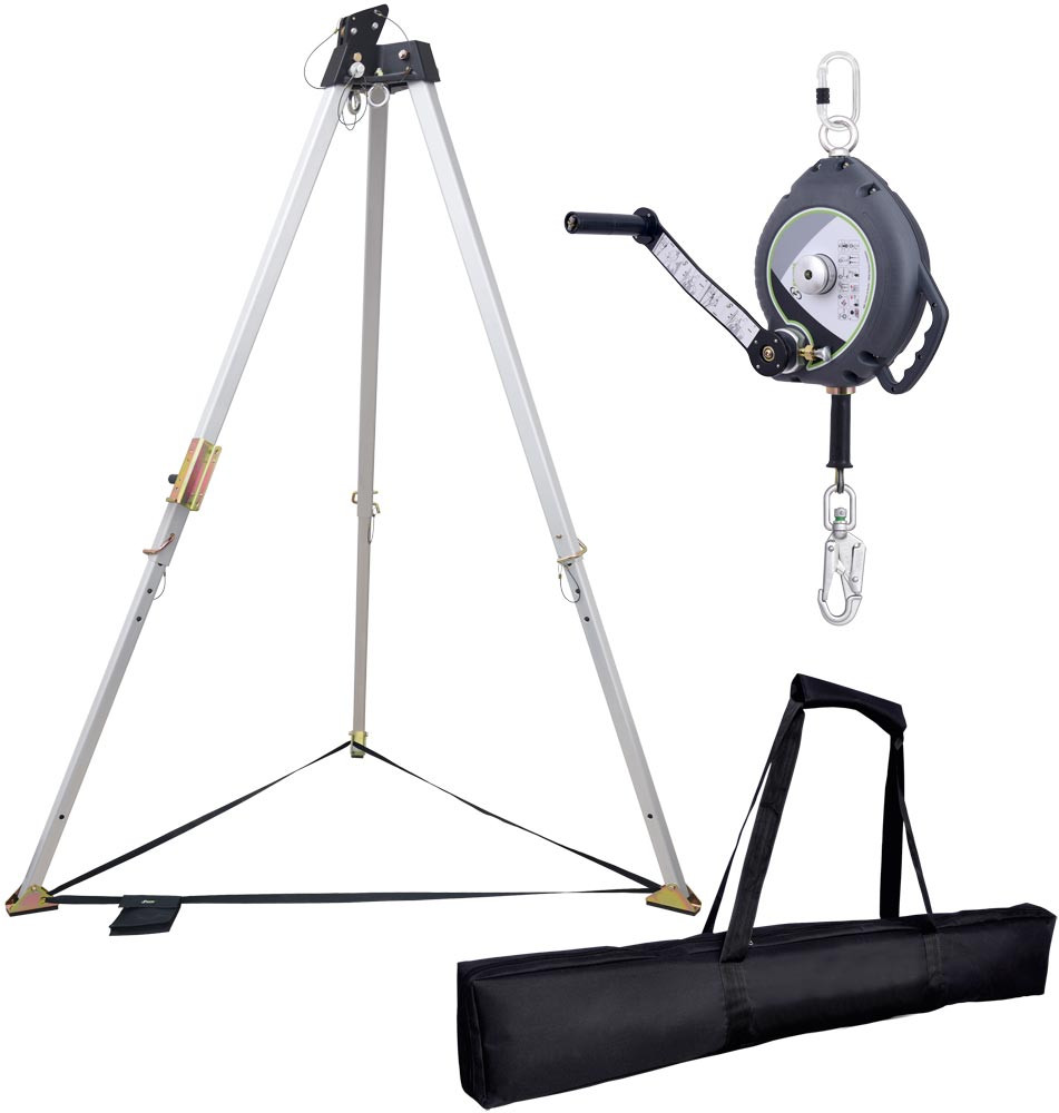 Zugelassen nach EN 795:2012 ∙ 2 Anschlagpunkte am Kopf ∙ 2 Umlenkrollen am Kopf ∙ Ausziehbare Beine ∙ Anti-Rutsch-Füße mit Gummi-Besatz ∙ Höhe verstellbar von 1,15 m bis 2,15 m ∙ Achsenabstand (je nach Höhe): 1,08 m bis 1,62 m ∙ Aus Aluminium ∙ Inklusive Höhensicherungsgerät mit Rettungskurbel, Länge 20 m, Anwendergewicht: 140 kg ∙ Abnehmbare Adapterplatte mit Umlenkrolle ∙ Eingebaute Vorrichtung für zusätzliche Seilwinde ∙ Maximalgewicht: 200 kg ∙ Inklusive Dreibaumtasche