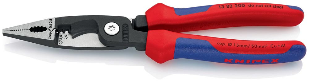 für die Elektroinstallation · zum Greifen von Flach- und Rundmaterial, Biegen, Entgraten, Kabelschneiden, Abisolieren und Crimpen von Aderendhülsen · schlanke Bauform für gute Zugänglichkeit · Spezial-Werkzeugstahl in Sondergüte, geschmiedet, mehrstufig ölgehärtet