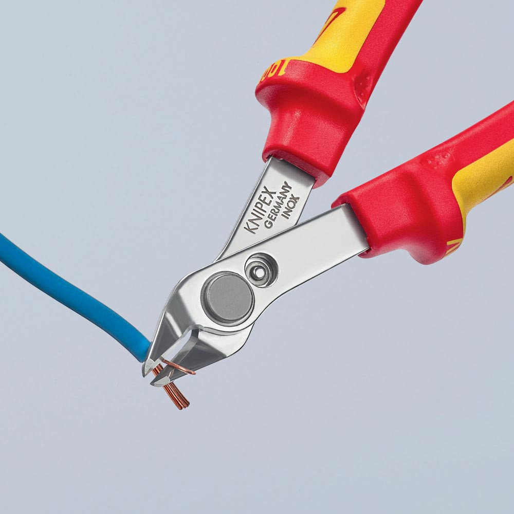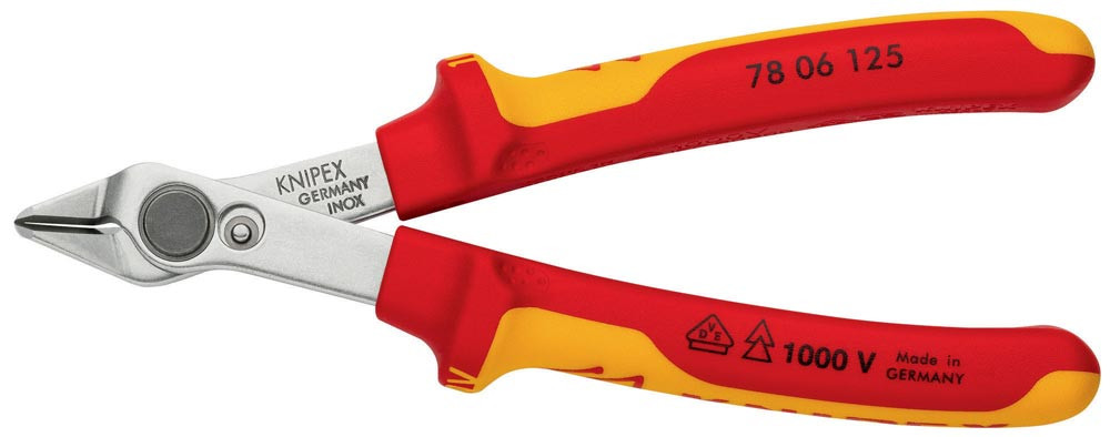 VDE-isoliert bis 1000 V · gefertigt gem. DIN EN/IEC 60900, stückgeprüft · für feinste Schneidarbeiten z. B. in Elektronik und Feinmechanik · geschliffene, sehr scharfe Schneiden · Gelenk mit Edelstahl-Niet · Schneiden zusätzlich induktiv gehärtet · mit Öffnungsfeder und Öffnungsbegrenzung · Inox
