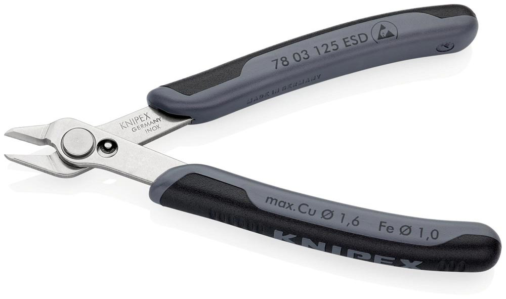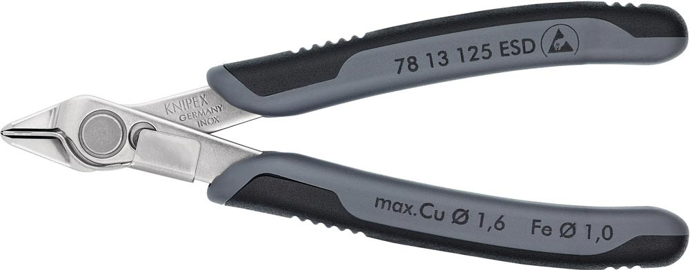 ESD · für feinste Schneidarbeiten z. B. in Elektronik und Feinmechanik · geschliffene, sehr scharfe Schneiden · Gelenk mit Edelstahl-Niet · Schneiden zusätzlich induktiv gehärtet · mit Öffnungsfeder und Öffnungsbegrenzung · Inox -Werkzeugstahl · elektrisch ableitend - dissipativ