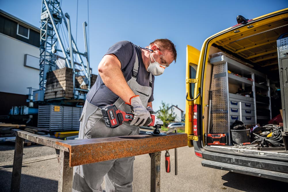 Lieferumfang: Solo (ohne Akku und Ladegerät), Schutzhaube, Handgriff, Stirnlochschlüssel, Spannflansch und Spannmutter