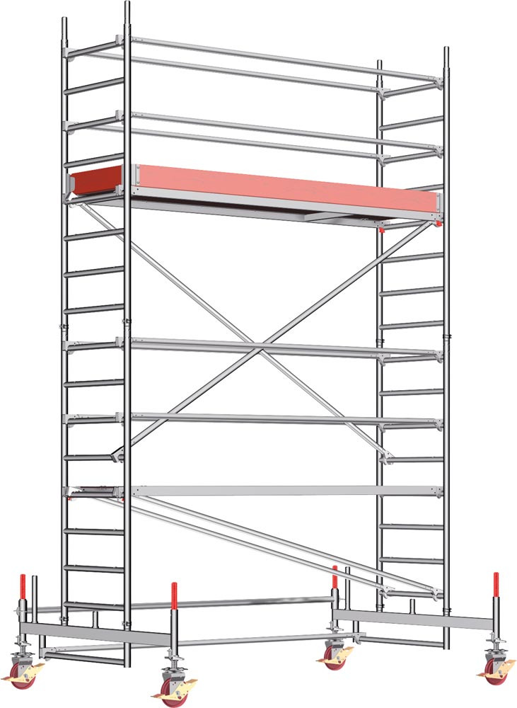 · Neuer Sicherheitsaufbau zur Realisierung kollektiver Schutzmaßnahmen durch Vertikalabstand der Plattformen von 2 m und sichere Bauform mit integriertem Seitenschutz · Mehr Stabilität im Fahrgerüst durch zusätzliche Aussteifungen