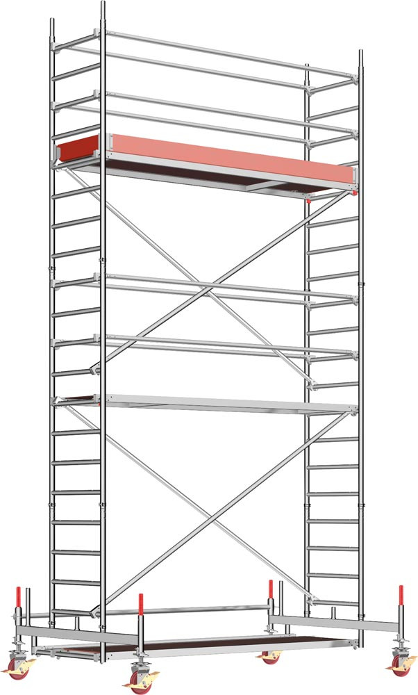 · Neuer Sicherheitsaufbau zur Realisierung kollektiver Schutzmaßnahmen durch Vertikalabstand der Plattformen von 2 m und sichere Bauform mit integriertem Seitenschutz · Mehr Stabilität im Fahrgerüst durch zusätzliche Aussteifungen