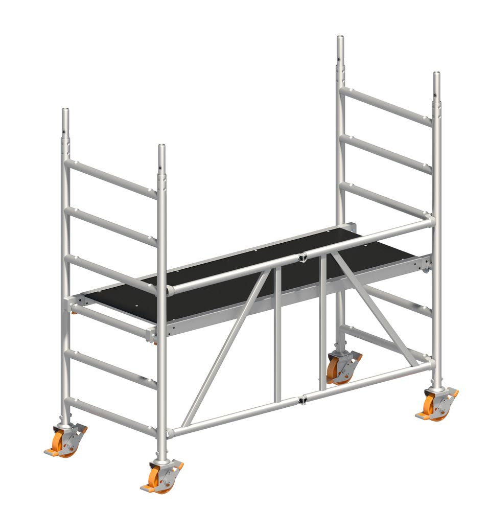 Für Arbeiten in geringer Höhe ∙ Die Grundeinheit kann aufgebaut und vollbepackt durch Standard-Zimmertüren gefahren werden ∙ Grundgerüst aus Aluminium für wechselseitige Steckmontage ∙ Geländer und Diagonalen aus Aluminium sind einfach einzurasten ∙ Arbeitsböden aus Aluminium-Rahmen und Sperrholz-Einlagen, auch als Durchstiegsbrücke für gefahrlosen Innenaufstieg ∙ Stabile, fest montierte Lenkrollen ∙ Zulässige Verkehrslast: 2 kN/m2 (Lastklasse 3) ∙ Sicherheitsaufbau P2 - entspricht der Norm DIN EN 1004:2021 ∙ Fläche Arbeitsbühne: 0,75 x 1,80 m
