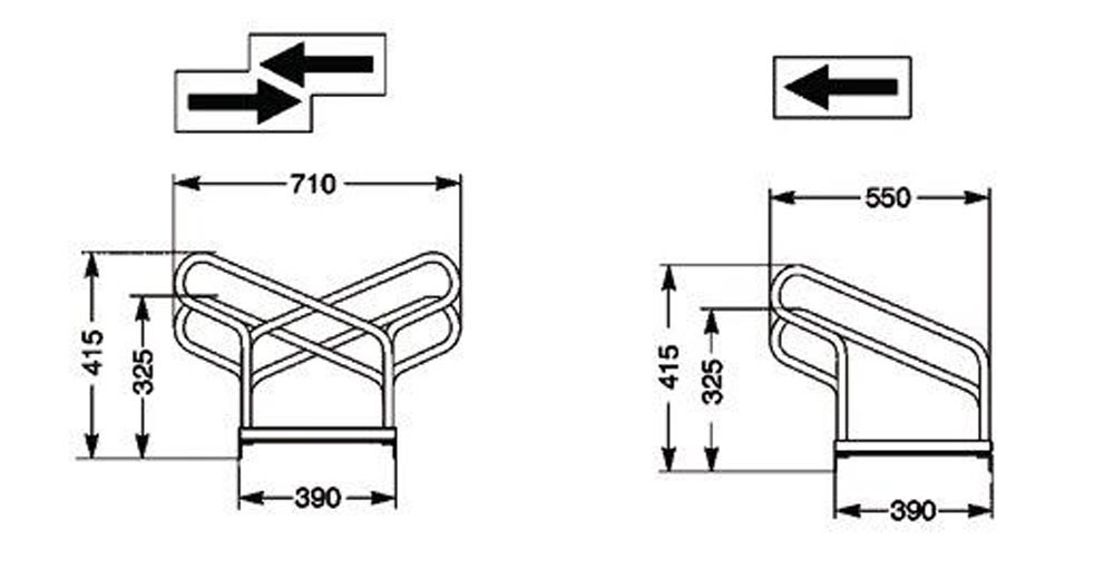 verschraubt · platzsparendes Parken der Fahrräder durch abwechselnde Tief-/Hochstellung · Radabstand 350 mm · stabile, feuerverzinkte Stahlkonstruktion mit robusten Rundrohr-Bügeln Ø 18 mm · wahlweise für ein- oder zweiseitige Radeinstellung · Bügelabstand für Reifenbreite bis 55 mm · zur Reihenverbindung und Bodenbefestigung geeignet · zerlegt im Karton, Schrauben und Montageanleitung beiliegend · einfache Montage