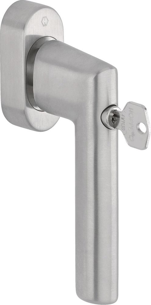 HOPPE-Edelstahl-Dreh-/Kipp-Fenstergriff mit SecuForte®, SecuTBT® und VarioFit®, abschließbar, erfüllt die Anforderungen nach DIN EN 1627-1630 RC1-6, Schließung: Drehzylinder, Wendeschlüssel, in 0°- und 90°-Stellung abschließbar, automatische Verriegelungsfunktion, automatische Sperrfunktion in Geschlossen-Stellung (0°) und in Kippstellung (180°), Stift: HOPPE-Vollstift, Befestigung: verdeckt, Gewindeschrauben M5