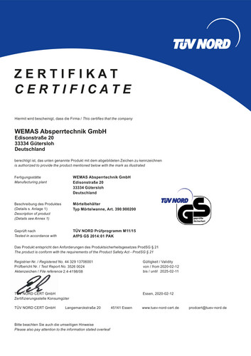 Mörtelwanne aus robustem und schlagzähem HDPE · für den Transport von Fertigmörtel · TÜV GS geprüft und CE-konform · Prüf-Nummer: 83843663867 · mit pulverbeschichtetem Stahlrahmen, kran- und stapelbar · Füllstrich bei 200 Liter · UV-stabilisiert · Verschleißrippen gegen Durchscheuern
