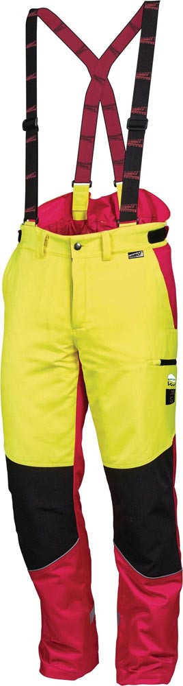 60% Polyester / 40% Baumwolle, ca. 240 g/m² · moderne Forstschutzbundhose aus Polyester-Baumwollgemisch · mit abnehmbaren, robusten Hosenträgern · neue Farbkombination rot/neongelb · angenehmer und leichter Tragekomfort durch die neuartige 6-lagige Schnittschutzeinlage · Bund mit Klett weitenregulierbar · Gürtelschlaufen · hochgezogener Nierenbereich · strapazierfähige Verstärkungen auf den Knien · Belüftungsöffnungen auf der Oberschenkelrückseite mit Reißverschluss verschließbar · schmale Reflexpipings an der Vorder- und Rückseite · Befestigungshaken für Schnürstiefel am Beinende · 2 Seitentaschen · 2 Gesäßtaschen sowie eine kleinere Beintasche · 1 Kettensägenschlüsseltasche · EN 381-5 Kl. 1