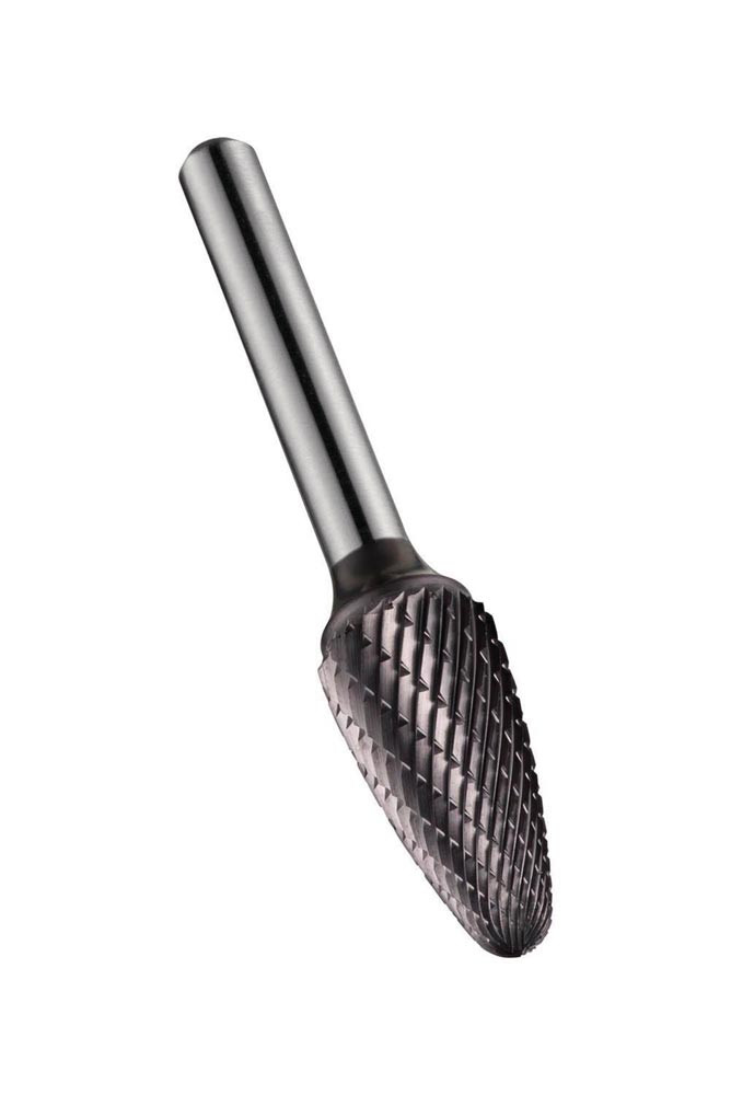 Abgerundeter Tannen-Frässtift (Form F) · Durchmesser 3mm mit 14mm Schnittlänge · 38mm Gesamtlänge und 3mm Schaft · Vollhartmetall mit TiAlN Beschichtung · DC doppelseitigem Schnitt mit enger Zahnteilung zum bearbeiten von Konturen mit mehreren Winkeln · Abrunden von Kanten und Schneiden in schwer zugängliche Bereichen in Stahl und Stahlguss · Edelstahl · Gusseisen · Kupfer oder Kupferlegierungen · Hochwarmfeste Legierungen · gehärtete Materialien
