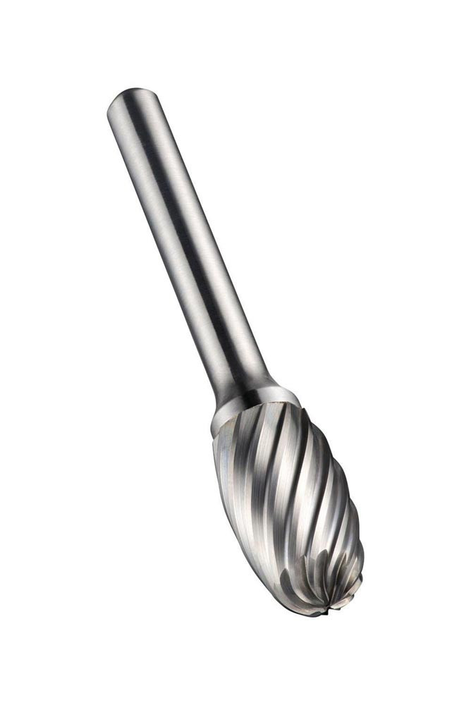 Ovaler Frässtift (Form E) · Durchmesser 9.6mm mit 16mm Schnittlänge · 60mm Gesamtlänge und 6mm Schaft · VHM mit gehärtetem Stahlschaft und blanker Oberfläche · VA einseitigem Schnitt mit mittlerer Zahnteilung zur runden Kantenformung in Edelstahl