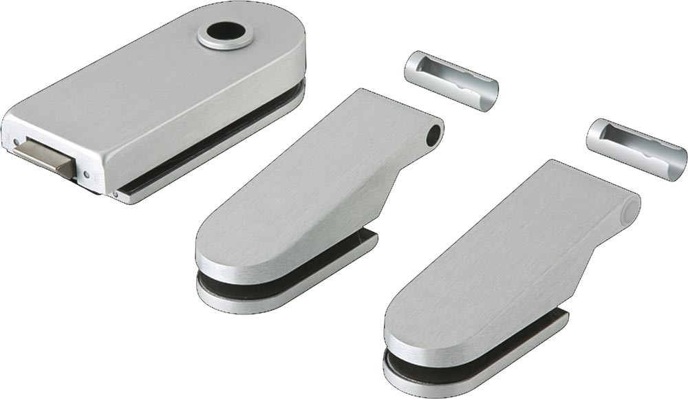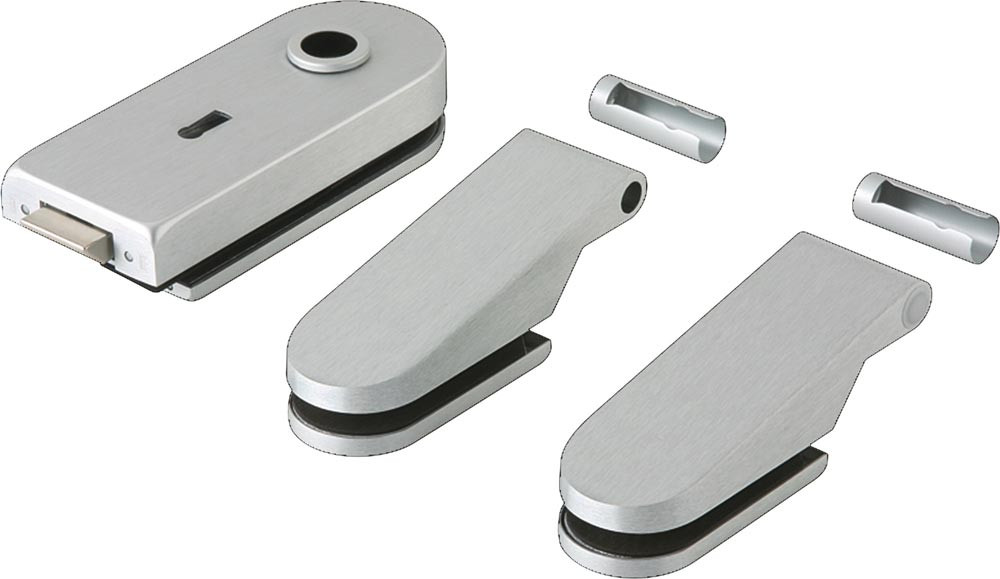 mit halbkreisförmigem Kappenende, zur Glasmitte zeigend · für 8 mm Glasdicke und 24 mm Falztiefe bzw. für 10 mm Glasdicke und 26 mm Falztiefe · DIN links / rechts verwendbar · Material Aluminium · für ESG 8 bzw. 10 mm · max. Türflügelgewicht: 60 kg / 80 kg (OFFICE Bänder) · Schlosskasten Abmessungen (BxHxT): 159x65x37 mm · Schloss nach DIN 18 251, Klasse 3 (200.000 Betätigungen der Fallenfunktion und 50.000 Betätigungen des Riegels, bei fest montiertem Beschlag nach DIN 18 257 · Einsatzbereich für 1-/2-flügelige Anlagen oder Anlagen mit Seitenteil · mit Drückerführung · ohne Drücker