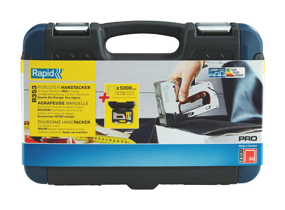 Lieferumfang: Handtacker R353, inkl. 5.000 Klammern (2.500 St. - 53/6 mm, 2.500 St. - 53/8 mm), im hochwertigen Kunststoffkoffer