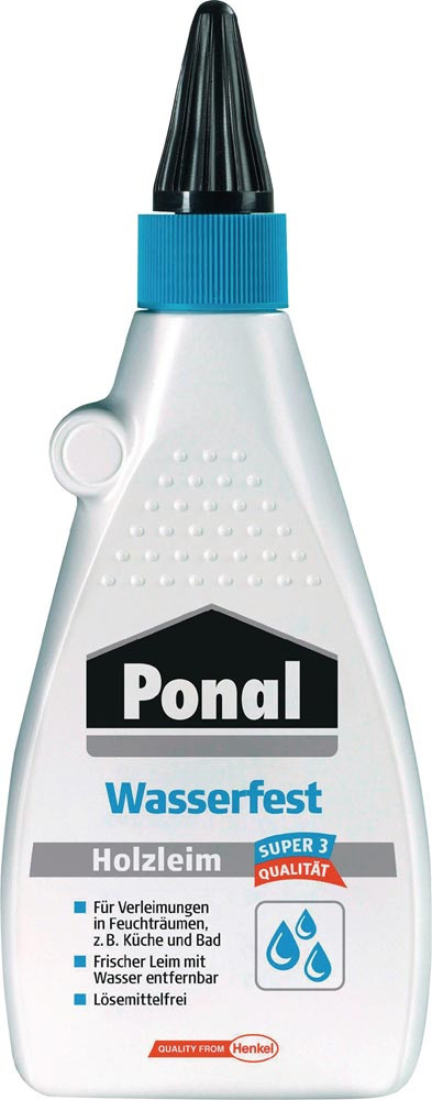 Weißleim für bedingt wasserfeste Verleimungen nach DIN EN 204 D3 · ideal für wasserfeste Montage-, Fugen- und Flächenverleimungen in der Innenanwendung · Verleimung von Fenster und Türen, von HPL auf Holzwerkstoffe, für den Möbelbau aus Holz, Montageverleimung (z.B. Dübel, Nut und Feder, Schlitz und Zapfen), Fugenverleimung (Massivholz, Anleimer, Umleimer), Verlegung von Fertigparkett · farblos nach Durchhärtung · lösemittelfrei · wiederholt aufhärtbar auf DIN EN 204/D4 mit Ponal D4 Härter Art.-Nr. 6012449
