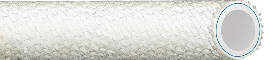 Industriewasserschlauch mit aufvulkanisierter Glasfaserummantelung · Elektrischer Widerstand Aussendecke: Isolierend >10⁹ Ω · Elektrischer Widerstand Schlauchseele: Isolierend >10⁹ Ω · Farbe Aussendecke: Weiss · Farbe Innenseele: Weiss · Fertigungsart Innenseele: Glatt · Fertigungsweise Aussendecke: Glasfaserumflechtung · Platzdruck: 60bar · Temperatur Strahlungshitze: +550°C