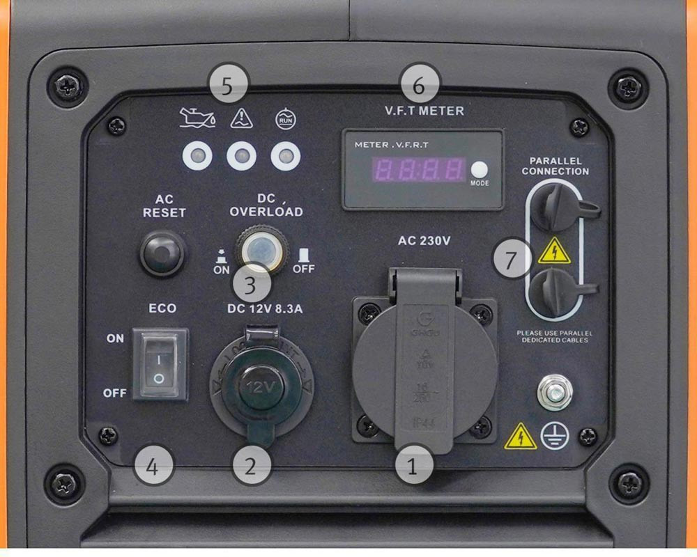 liefert Strom mit reiner Sinuswelle für Geräte mit empfindlicher Elektronik, wie z.B. PC‘s · konstante Leistungsabgabe · geräuscharmer Betrieb · leistungsabhängige, stufenlose Drehzahlregulierung · ECO-Modus · Kontrollleuchten für Ölmangel oder Betriebsstörungen · Choke