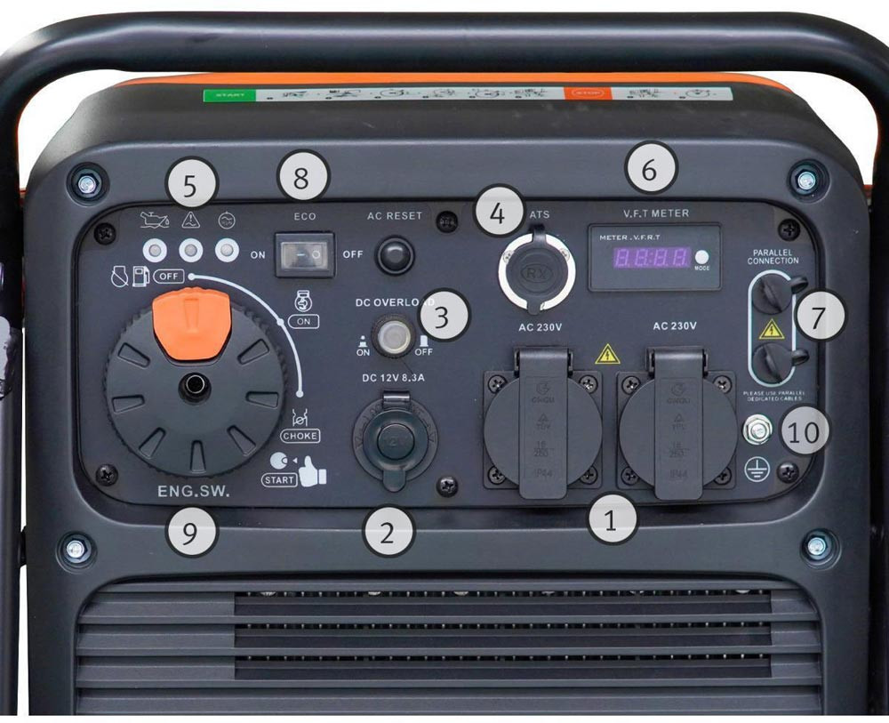 liefert Strom mit reiner Sinuswelle für Geräte mit empfindlicher Elektronik, wie z. B. PC`s · konstante Leistungsabgabe · geräuscharm · leistungsabhängige, stufenlose Drehzahlregulierung · ECO-Modus · Elektrostart: Starten auf Knopfdruck · Kontrollleuchten für Ausgangsspannung, Überlastung und Ölmangel · Choke · Fahrwerk und Transportgriff · geeignet für die Hauseinspeisung mit manuellem optionalem Netztrennschalter