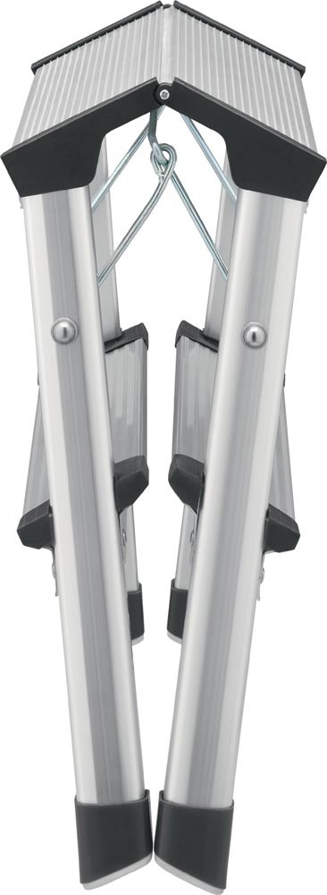 Aluminium · leicht und handlich · platzsparend, zusammenklappbar · Stufen mit Anti-Rutsch-Riffelung · Holme eloxiert · Sicherheitsverriegelung · 2-Komponenten-Kunststofffuß für sicheren Stand auf verschiedenen Böden · max. Gesamtbelastung 150 kg