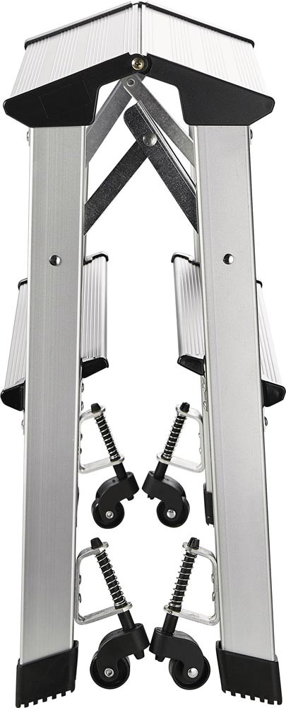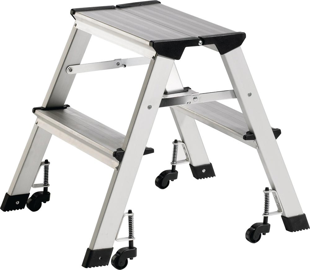 fahrbar · aus stabilem Aluminium, zusammenklappbar · durch die 4 Gleitrollen frei beweglich (360°) · Klapptritt senkt sich bei Belastung unverrückbar und bietet sicheren Stand · alle Kanten durch Kunststoffkappen geschützt · max. Gesamtbelastung 150 kg