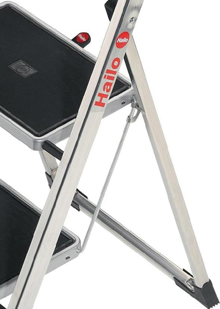 schmal zusammengeklappbar · stabile Aluminium-Holme · Stahl-Stufen silbergrau-beschichtet, mit schwarzem Anti-Rutsch-Belag · breite Stufen für hohen Standkomfort · Sicherheitsverriegelung · max. Gesamtbelastung 150 kg · geringes Gewicht · Zusammengeklappt nur 60 mm schmal