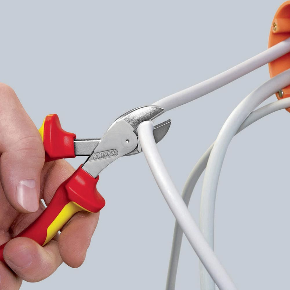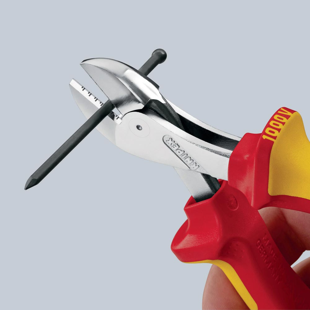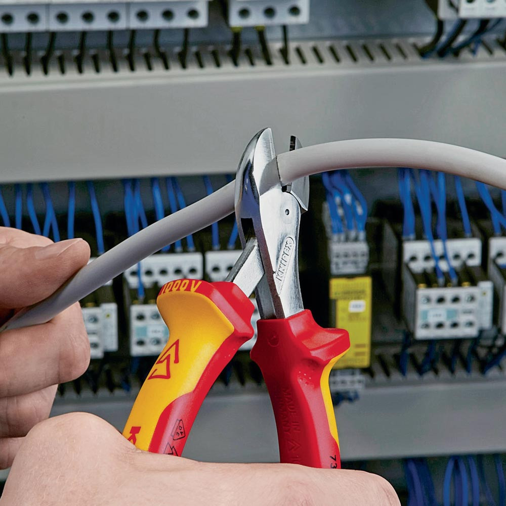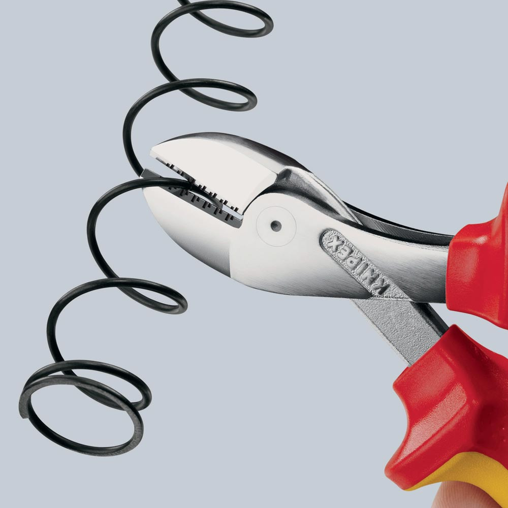 VDE-isoliert bis 1000 V · gefertigt gem. DIN EN/IEC 60900, stückgeprüft · 40 % Kraftersparnis gegenüber herkömmlichen Seitenschneider · doppelt gelagerte Gelenkachse · durchgestecktes Gelenk · für alle Drahtsorten einschließlich Pianodraht · auch für dünne Cu-Drähte · große Öffnungsweite für dickere Kabel · kompakte, gewichtssparende Bauweise · Chrom-Vanadin-Hochleistungsstahl, geschmiedet, mehrstufig ölgehärtet